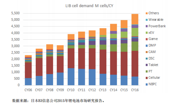 此外,日本B3信息咨詢公司2015年發布的鋰電市場分析報告顯示,以鋰電池電芯數量出貨量計算,2015年全球鋰電同比增長約11.02%,考慮到單顆電芯的容量穩定上升及動力鋰電的迅速發展,過去十年,鋰電正極材料行業保持了24%的復合增長率,2015年鋰電正極材料出貨量達到15.4萬噸。鋰電池在智能手機、電動工具、電動汽車等應用領域發展樂觀。2006年~2016年鋰電池應用領域發展趨勢見下圖: