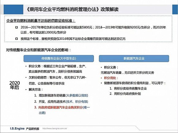 國家為規范新能源汽車市場有序發展,于2015年10月,出臺了廠商廣受關注的《乘用車企業平均燃料消耗管理辦法(草稿)》,使得乘用車企業平均燃料消耗管理將趨于落實。據相關預測僅2016年其不達標企業需繳罰款就可能達到近百億元,而至2020年,傳統整車企業解決的辦法或許只有向政府或新能源汽車企業購買積分唯一出路。