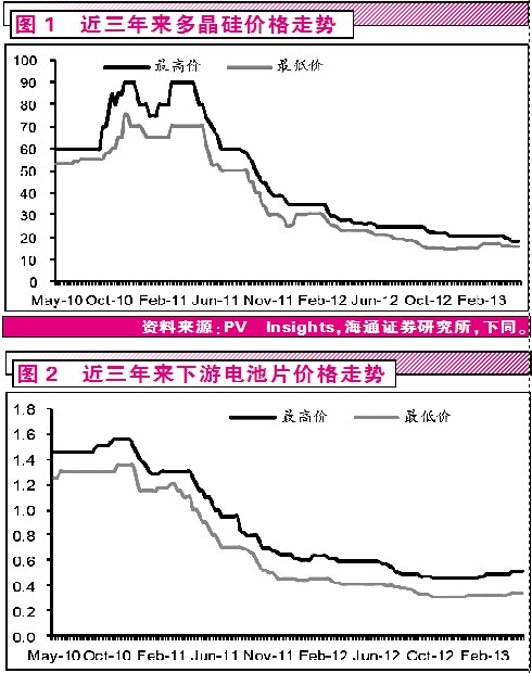 從行業復蘇的邏輯上看,最沒有技術含量的晶硅制造企業依然受到原料進口和價格的雙重壓力,業績復蘇或許會晚一些,但利潤與股價波動的周期性特征卻會比較顯著。而2013年國內光伏需求的爆發,最直接受益的則是下游公司,因為下游企業更受益于國內市場需求的回升以及受“雙反”制裁影響較小,比如做國內光伏項目的EPC總包商特變電工,以及占國內逆變器30%份額的陽光電源,電站開發商海潤光伏、航天機電、中利科技等。其后依次才是組件、電池片、硅片、多晶硅等中上游公司,而以曾經的大牛股精功科技為代表的光伏設備股則受益較小,因為行業擴產高峰已過,剛剛喘過來氣的光伏企業不會立即上馬新生產線,這點從光伏設備股走勢較弱也可以看出端倪。