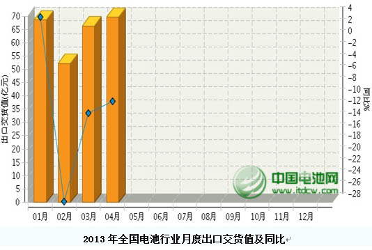 據中國輕工業預測預警系統顯示:2013年1月-4月,全國電池行業規模以上企業累計完成出口交貨值同比增長-11.48%。其中:4月份完成出口交貨值同比增長-10.69%。