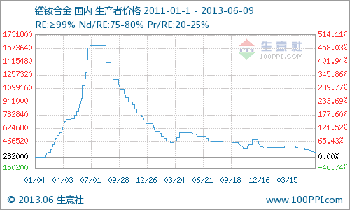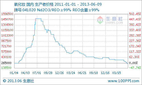 6月8日稀土指數為303點,創下周期內的歷史新低,較2011年12月06日最高點1000點下降了69.70%。(注:周期指2011-12-01至今)。自2011年下半年以來,稀土市場經歷了一個長期的走跌過程,直至現在稀土市場依舊低迷。生意社價格數據顯示,截止到今日(6月9日)相較于2011年的最高點,氧化鐠跌幅69.47%,氧化釹跌幅83.37%,鐠釹氧化物跌幅80.39%。