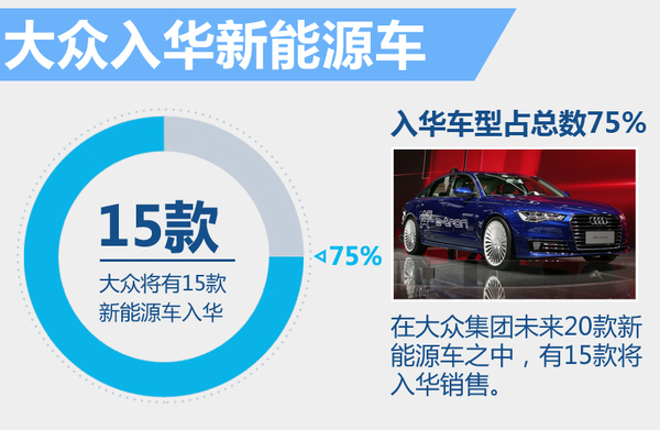 根據(jù)大眾集團(tuán)在新能源領(lǐng)域的規(guī)劃,到2020年,大眾集團(tuán)將陸續(xù)推出20款新能源汽車,其中面向中國市場的數(shù)量將達(dá)到15款,照此看來,未來中國市場銷售的大眾新能源車將占總數(shù)的75%。首款實(shí)現(xiàn)在華國產(chǎn)的A6L e-tron將在年內(nèi)上市,專為純電動車打造的MEB平臺也將在之后引入國內(nèi),推進(jìn)大眾純電動車的本地化生產(chǎn)進(jìn)程。