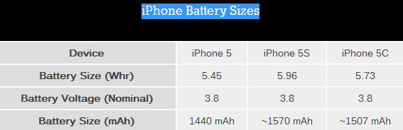 iPhone 5的電池容量為1440毫安、5.45Whr,iPhone 5C增大到了1507毫安、5.73Whr,iPhone 5S則進一步增至1570毫安、5.96Whr。電壓全部都是3.8V。
