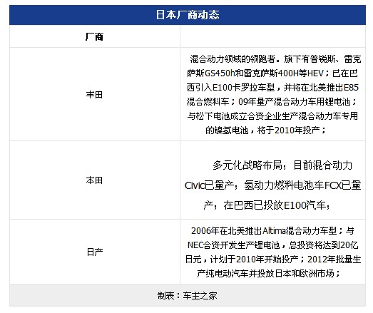 日本汽車廠商鋰電池開發(fā)較早,且投入較大,多數(shù)由企業(yè)已與電池生產(chǎn)企業(yè)進(jìn)行技術(shù)層面合作,在混合動(dòng)力汽車和電力汽車領(lǐng)域處于領(lǐng)先地位。