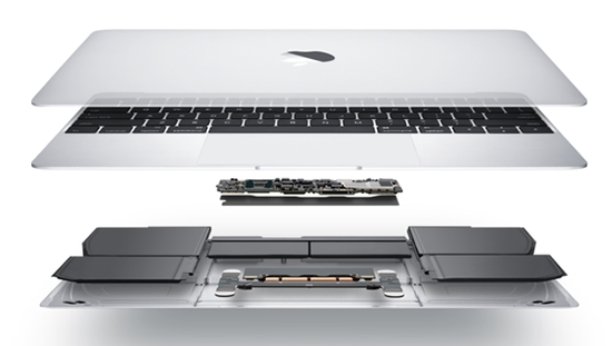 全新的Macbook使用了電池堆疊技術(shù),蘋(píng)果的工程師們?cè)O(shè)計(jì)出了一個(gè)階梯狀的蓄電池格,能為蘋(píng)果產(chǎn)品增加35%的電量。