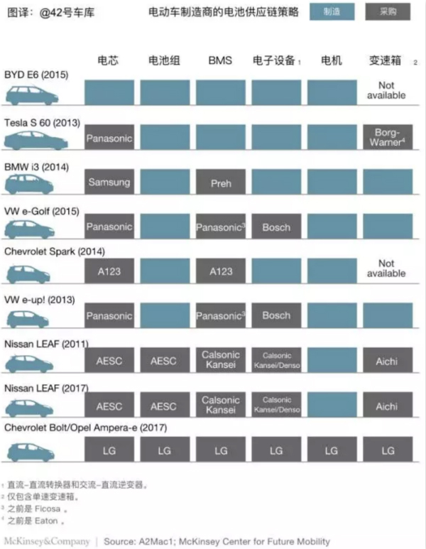 5、特斯拉和比亞迪在動力總成的垂直一體化上完成度是最高的,而通用則是采用了所有零部件都外包的策略,廠家的不同策略影響了傳統供應商的競爭定位。