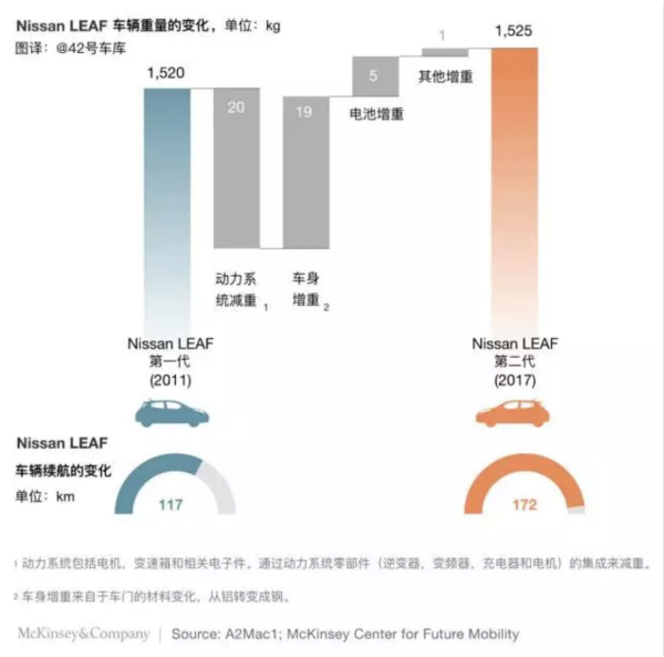 3、在國內廠商大肆宣傳鋁車身輕量化的同時,這些全球暢銷的電動車關注點卻不在鋁車身上,輕量化對于電池續航的影響權重似乎并沒有那么高。最有意思的是二代 Nissan Leaf ,車身重量竟然是增加的,而大幅的減重是來自于動力系統。