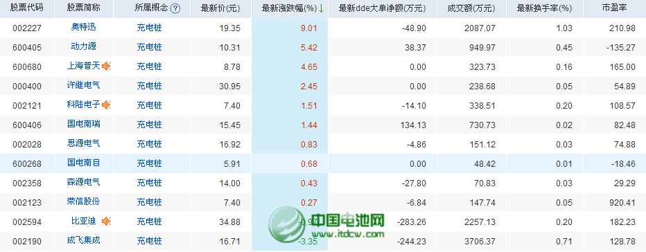 受綜合因素影響,今日早盤開盤充電樁概念上市公司集體大漲,奧特迅、動力電源、上海普天、許繼電氣、科陸電子、國電南瑞漲幅領(lǐng)先,其中奧特迅漲幅為9.01%,接近漲停。