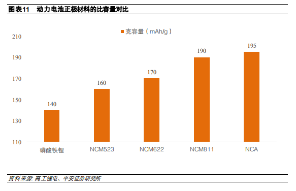 2) 三元鋰離子電池中添加鎳元素可以提升正極材料的比容量,目前三元鋰離子電池 NCM523 裝機(jī)量占比最大,但是未來鎳含量更高的NCM622、NCM811 電池占比將逐步提升。