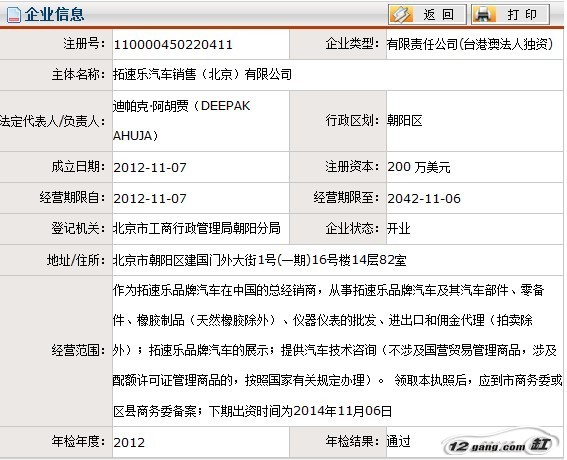 12缸通過北京市工商局的官方網站查詢得知,“拓速樂”公司于2012年11月7日已經成立,注冊信息當中的經營范圍是如此描述的:作為拓速樂品牌汽車在中國的總經銷商,從事拓速樂品牌汽車及其汽車部件、零備件、橡膠制品(天然橡膠除外)、儀器儀表的批發、進出口和傭金代理(拍賣除外);拓速樂品牌汽車的展示;提供汽車技術咨詢(不涉及國營貿易管理商品,涉及配額許可證管理商品的,按照國家有關規定辦理)。 領取本執照后,應到市商務委或區縣商務委備案;下期出資時間為2014年11月06日 。