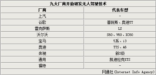 作為未來主要的研發(fā)技術(shù)之一,無人駕駛技術(shù)已有9大廠商開始涉足,其中包括谷歌、雷克薩斯、沃爾沃、奔馳等,其中所設(shè)計(jì)的車型更是涵蓋了A級(jí)到D級(jí)各個(gè)級(jí)別的車型。同時(shí)上汽集團(tuán)則是國(guó)內(nèi)少數(shù)進(jìn)入該領(lǐng)域研究的廠商之一,以在國(guó)內(nèi)自主品牌競(jìng)爭(zhēng)中,擁有更多經(jīng)驗(yàn)。