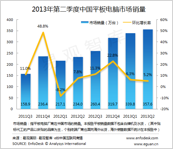 易觀國際最新監(jiān)測的數(shù)據(jù)顯示,2013年第二季度中國平板電腦的銷量達到了357.6萬臺,環(huán)比增長5.2%。值得注意的是,蘋果頹勢明顯,且難以抑制其市場份額被蠶食的趨勢。