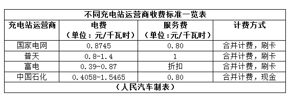 不同充電站運(yùn)營商收費(fèi)標(biāo)準(zhǔn)一覽表