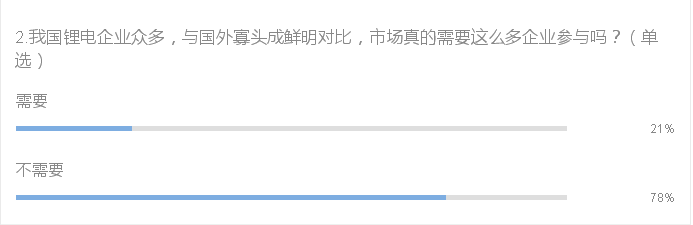 我國鋰電企業數量在十二五、十三五期間瘋狂增長,然而大而精的企業也為數不多,更多的則是拿到生產資質只為踏上這班順風車。整理行業人士的看法,有接近八成的被調研者認為市場不需要過多鋰電企業的參入。一方面,小而散的態勢得不到控制,產品的精細度以及可靠性得不到保證。另一方面,參差不齊的鋰電企業所產生的不良性競爭也將給產業帶來負面影響。