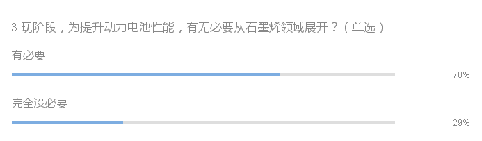 石墨烯在動力電池領域的應用一直是業內熱議的話題。現階段,將石墨烯新型材料加入電池成分當中是很多企業提出的可行的辦法。再調查問卷中,有七成的被調研者認為從石墨烯領域展開研究動力電池是十分有必要的。目前我國新能源汽車產業迫切需要提升電池性能,續航里程則是衡量一款電動汽車合格與否的標尺。而想要在眾多新能源車型中脫穎而出,動力電池性能的提升則至關重要,石墨烯優秀的性能順理成章成為了行業關注的熱點。