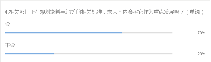 月初,三部委聯合印發《裝備制造業標準化和質量提升規劃》中明確提到:繼續研究和完善汽車能耗及相關節能技術標準。制定插電式混合動力汽車、純電動汽車、燃料電池汽車等新能源汽車以及動力電池等零部件相關標準。世界范圍內,豐田也正在大力研發燃料電池汽車。問卷中顯示,七成的被調研者認為國內未來會將燃料電池作為重點發展。目前國內燃料電池客車為主要研發成果,行業內也對燃料電池比較看好,相關設施諸如加氫站等的建設也在展開。