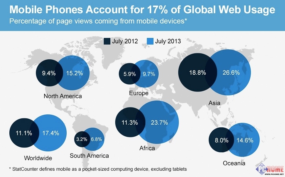 由于移動智能設備的高速發展,人們上網的方式也隨之得到改變。過去我們通過傳統的桌面電腦上網沖浪,而如今每個人都可以通過自己手上的手機漫游全球網絡。根據StatCounter發布的最新報告顯示,截至至2013年7月,全球互聯網17.4%的網絡流量來自于移動智能終端,這一數字與去年同期相比增長了6%。