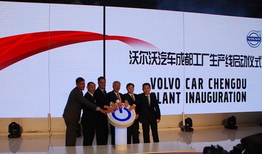 開業典禮當天,沃爾沃S60中國第一位車主,京劇表演大師梅葆玖先生、沃爾沃汽車集團生產與采購高級副總裁拉爾斯.韋伯(Lars Wrebo)、沃爾沃汽車中國業務高級副總裁拉爾斯.鄧(Lars Danielson), 以及去年在成都舍己救人的“洋雷鋒”生產制造工程師哈羅德.葛貝爾(Harald Gobel)一同登臺,在各級政府領導和瑞典大使館代表、媒體的見證下,為成都工廠的啟動拉開序幕。
