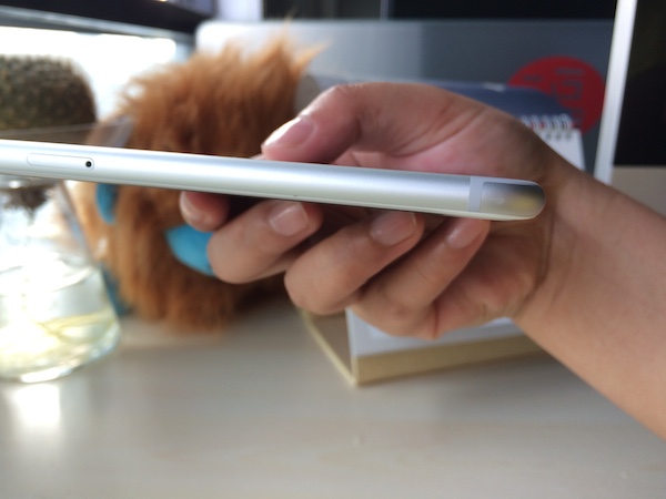 雖然沒有遇到壓彎門,但是還是不建議用戶裸奔,因為 iPhone 6 Plus 的邊框容易受傷。只是從手中滑落在地板上,iPhone 6 Plus 的兩個圓滑邊框就出現(xiàn)了凹陷,雖然不影響使用,也不影響整體美觀,但心里還是有些不舒服。這個問題在 iPhone 5s 也同樣碰到,如圖(好吧,我承認我是一個愛裸奔又毛手毛腳的用戶)。