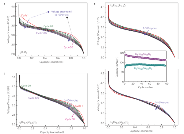 在把不同的材料的放電比容量都歸一化后,可以明顯看到100周后,添加了Sn4+的Li2Ru0.75Sn0.25O3材料和沒有添加Sn4+的Li2RuO3對比,前者的衰減程度要好得多,再看上圖c,對著加入Sn4+的濃度的增加(Li2Ru0.75Sn0.25O3和Li2Ru0.25Sn0.75O3),衰減趨勢進一步得到控制,但是相應的放電比容量也跟著下降!