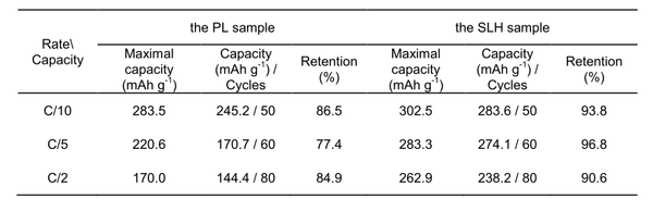 SLH的40C倍率數據還要好于PL的20C數據,這還讓富鋰混不?40C是什么概念?相當于1分半中就能有100mAh/g的比容量,這個誠意滿滿的是奔著電動車的終極方案——集動力與高比能為一體而去的,只不過嘿嘿,他們沒給充電曲線。而且他們放電到了1V,電化學的勢窗過大,這個是比較危險的,鑒于只是半電池的實驗,也就無所謂了。