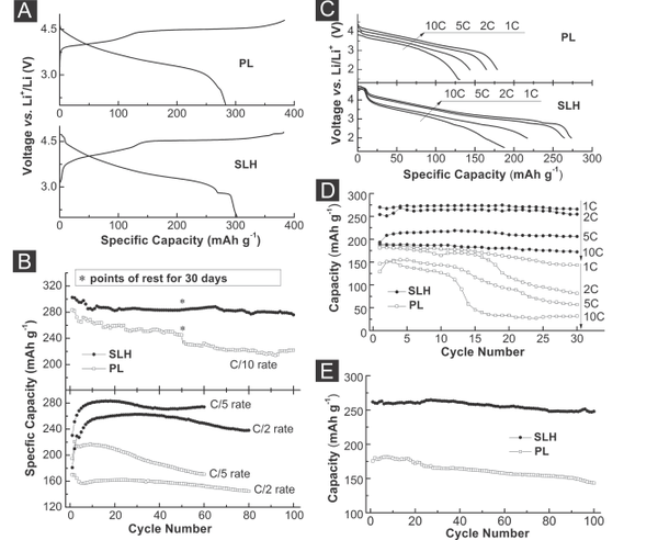 圖A是一個首圈的充放電比較,SLH材料明顯高于PL(Pristine Layered,普通富鋰),而且在3V以下有一個明顯的小平臺(Mn3+還原為Mn2+)提供了額外的容量,這個熟悉高電壓尖晶石鎳錳酸鋰的都知道是怎么回事,這里不再贅述。圖B主要是比較了0.1C下循環的穩定性,而且SLH的保持率要高于PL的,0.2C和0.5C還沒有循環完全,從趨勢上比較,SLH的也是要更勝一籌!圖C是完全拉開差距的一張圖片,SLH的倍率性能在1C、2C、5C和10C下完勝PL材料!圖D只有30周的循環,不能用作比較,不太嚴謹這里。圖E是兩種材料1C下循環100周的比較,SLH無論在比容量還是循環保持率上都技高一籌。