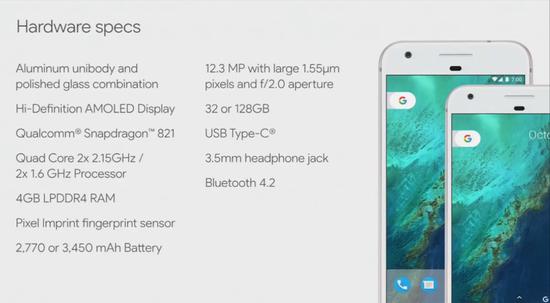 5英寸的Pixel和5.5英寸的Pixel XL擁有完全相同的基礎硬件配置,包括驍龍821處理器,4GB的RAM+32/128GB的ROM,并支持內存卡擴展。后置1200萬像素、f/2.0鏡頭,支持光學防抖,前置800萬像素鏡頭。配備USB-C接口、指紋識別模塊以及3.5毫米的耳機接口。
