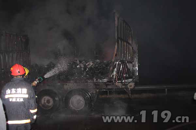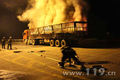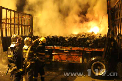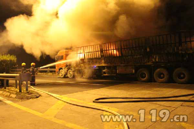 官兵到達現(xiàn)場后發(fā)現(xiàn),車廂內濃煙滾滾,并伴有火光。根據(jù)現(xiàn)場情況,大隊指揮員立即下達命令:水罐消防車單干線出一支水槍保護掛車駕駛室及油箱,高噴消防車單干線出兩支水槍撲救車廂火災。經(jīng)過全體官兵近2個小時努力,大火成功被撲滅。