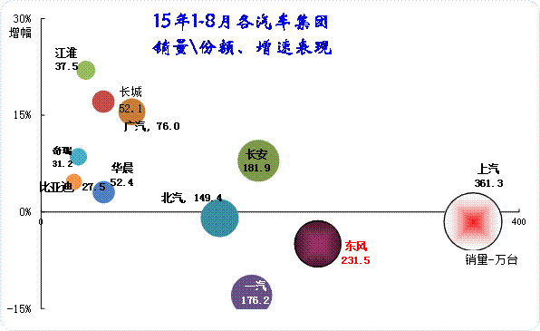 15年1-8月的大集團(tuán)走勢(shì)分化嚴(yán)重,一汽和東風(fēng)嚴(yán)重的負(fù)增長(zhǎng),而長(zhǎng)安和廣汽表現(xiàn)較好。中小集團(tuán)中只有華晨表現(xiàn)稍差。一汽和東風(fēng)等大集團(tuán)因?yàn)樯逃密嚨谋戎剌^大,經(jīng)濟(jì)下滑影響卡車表現(xiàn),因此表現(xiàn)稍差可以理解。