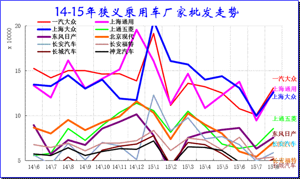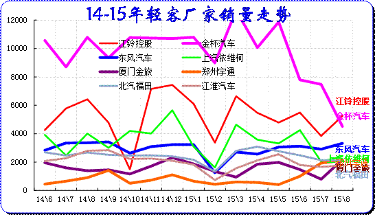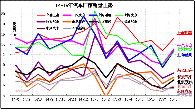 廠家表現(xiàn)分化,15年南北大眾和通用三強(qiáng)中都強(qiáng)力降低批發(fā),降低經(jīng)銷商的庫存壓力,因此8月批發(fā)走勢(shì)下降。日系沖刺很猛表現(xiàn)突出。長(zhǎng)安沖刺較猛,長(zhǎng)安福特表現(xiàn)較強(qiáng),長(zhǎng)安系總體超常規(guī)增長(zhǎng)。