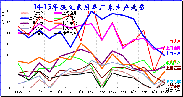 15年8月的廠家產(chǎn)銷競(jìng)爭(zhēng)仍是較激烈的,走勢(shì)差異性大,主力廠家全面回調(diào)。三強(qiáng)的主力廠家的一汽大眾和上海通用的產(chǎn)量調(diào)整較大;日系的生產(chǎn)增量較強(qiáng),形成強(qiáng)力增產(chǎn)增庫存的現(xiàn)象。