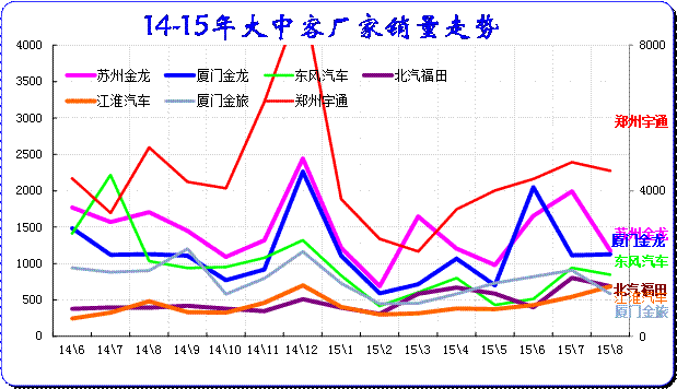 由于新能源補(bǔ)貼和客運(yùn)需求的促進(jìn),15年6月的大客的市場(chǎng)表現(xiàn)較強(qiáng),8月延續(xù)走強(qiáng)態(tài)勢(shì),宇通和金龍等主力企業(yè)走勢(shì)很好。