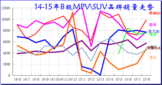 8月B級SUV市場走勢較強,而MPV車型均表現一般。奧迪Q5銷量超強,隨后是奔馳GLK也增長較強,豪華B級SUV市場小幅變化。而主流B級SUV市場的格局逐步穩定,漢蘭達已經調整到位并強力反彈,銳界的上市迅速成為第一,也帶來B級SUV的更充分的競爭。新勝達的壓力較大。