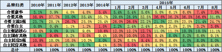 15年8月的豪華車走勢仍較強,份額達到7.5%的近期高點。雖然15年自主較強,但淡季8月的豪華品牌相對前幾個月走強,自主處于淡季走弱。合資主力車型15年相對14年的普遍走弱。