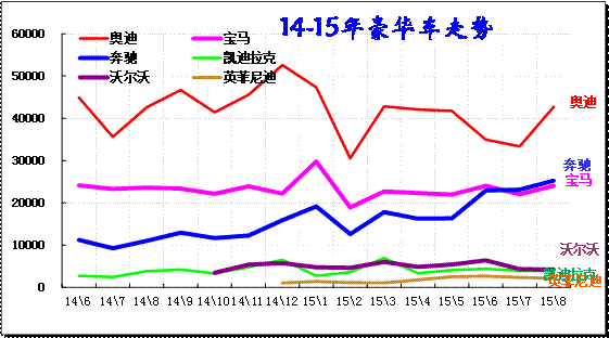 豪華SUV是爭奪焦點,8月的豪車SUV表現相對較強。奔馳GLK的增長勢頭較強勁,而奧迪Q5經過兩個月調整而進入回升期。A級豪華SUV表現偏弱,近期的寶馬X1走勢弱于奧迪Q3,奧迪的suv優勢較明顯,隨著奔馳GLA推出,豪車的國產化競爭更為充分。奔馳GLK的銷量也是持續走強,而沃爾沃XC60和英菲尼迪QX50也進入國產低價競爭序列,豪華B級SUV等的競爭加劇。而消費者對豪車的B級車型的需求逐步增大。