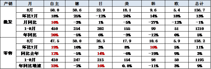 8月的批發(fā)增速差距也較大,自主品牌的增速在高增速區(qū)間,日系8月的批發(fā)增速24%較好。1-8月的歐美主力車系同比零增長,只有自主品牌較突出。