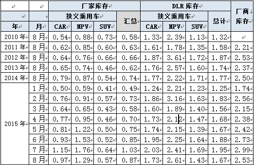 從庫存指數(shù)看,今年8月末的廠家?guī)齑孢_(dá)到0.87個(gè)月的銷量,今年的廠家?guī)齑嫔疃鹊陀跉v年8月的正常水平。經(jīng)銷商庫存降至1.67個(gè)月水平,較前兩年的1.75左右相對偏低。由于市場巨變的低迷,8月的廠商庫存合計(jì)是2.53個(gè)月,屬于總體庫存較合理的水平。