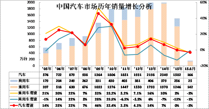 圖表 1汽車05-2015年表現對比分析 單位 萬臺,%
