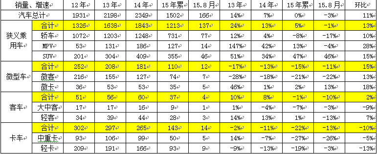 根據中國汽車工業協會數據,14年汽車總計銷量2350萬臺,累計增速7%;15年1-8月汽車總計銷量1500萬臺,同比增長0%,8月增速較年度增速增速相對偏低,這主要是乘用車的較差,而商用車表現有所改善。15年1-8月的乘用車增速達到3%,增速稍弱于預期。