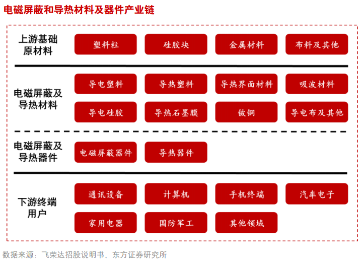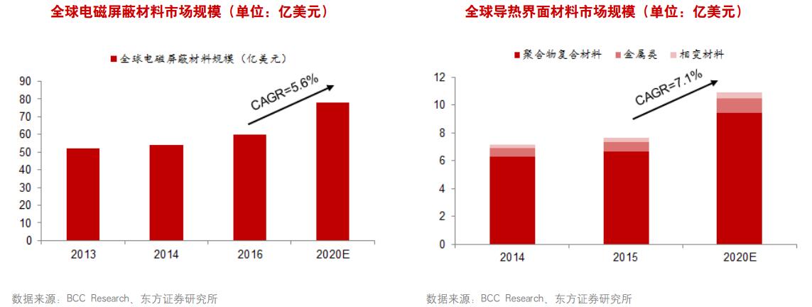 隨著5G時代下游市場的快速發展,單機需求量的提升疊加終端設備數量的增加,將帶來電磁屏蔽和導熱材料和器件的巨大增量需求,東方證券認為2021年以后,電磁屏蔽與導熱材料市場有望實現更快速的增長。