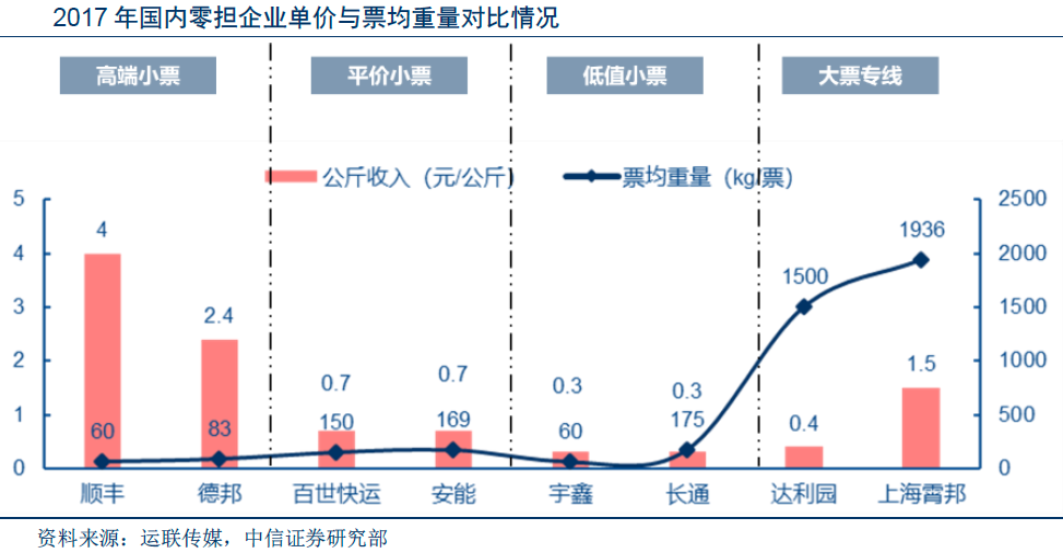 中信證券對比順豐、德邦、通達(dá)公司的零擔(dān)業(yè)務(wù),發(fā)現(xiàn)順豐、德邦零擔(dān)價格在2~3元/kg,而通達(dá)公司價格均在1元/kg以下,主要是順豐、德邦重貨業(yè)務(wù)定位價值量較高商品的運輸,時效較快,并且提供門到門配送服務(wù)。而順豐價格又要高于德邦,主要在于順豐通過自有飛機(jī)提供航空貨運,時效高,有溢價能力。
