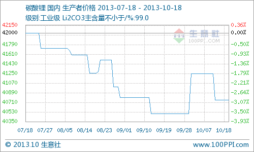 據生意社大宗榜數據顯示,本周國內工業級碳酸鋰行情報價平穩,整周國內企業出廠均價一直保持在為40750元/噸,未發生變化,當前價格同比去年下降了7.03%。