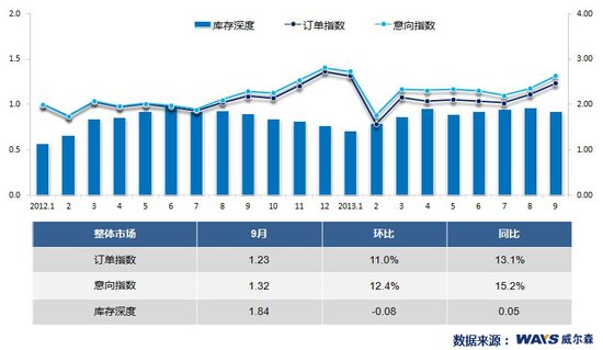 踏入車市傳統的銷售旺季,9月消費者購車意愿增強,加上多地車展提振人氣,經銷商加大促銷力度,整體市場意向、訂單環比均大幅上升。廠家加大批發量,終端零售情況良好,庫存快速消化,本月庫存深度有所下降。