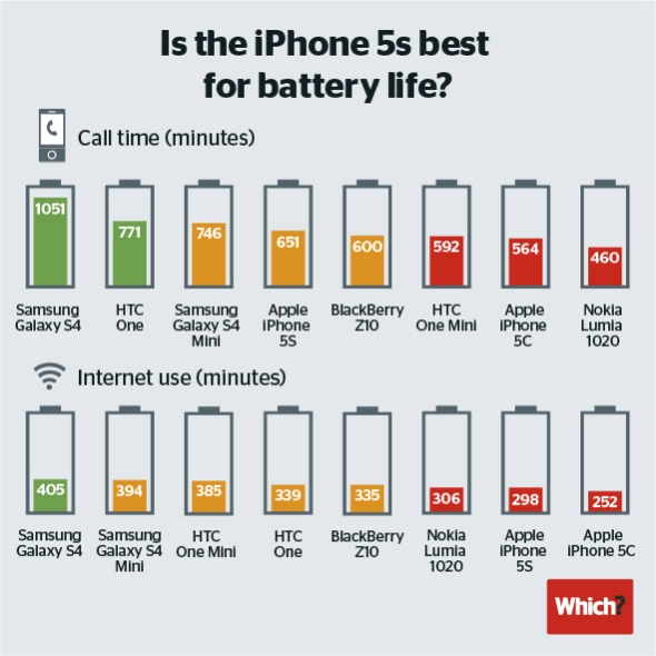 具體成績方面,通話測試中三星Galaxy S4電池可續航1051分鐘,雄居第一;HTC One電池續航771分鐘,位居第二;三星Galaxy S4 mini為746分鐘,位居第三;而位居第四的iPhone 5S電池續航僅為651分鐘,比三星S4足足短了7個小時;黑莓Z10和HTC One mini分別位居第五和第六;iPhone5C僅位列第七,電池續航564分鐘。