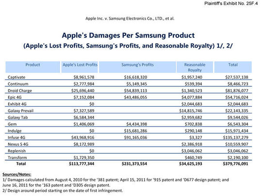 在提交給陪審團(tuán)的三星侵權(quán)產(chǎn)品圖表中,蘋果著重指出了兩款銷售額最高的手機(jī)設(shè)備,包括Infuse4G(累計銷售額1.35億美元)和Droid Charge(8100萬美元),這兩款手機(jī)目前已經(jīng)在美國地區(qū)下市。