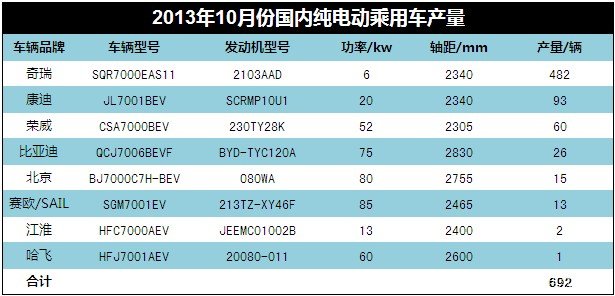 2013年10月份國內純電動乘用車總產量692輛,其中奇瑞482輛,占比70%以上;其次是康迪93輛,占比13%;榮威、比亞迪、北京、賽歐依次占比9%、4%、2%、2%,江淮和哈飛最少,總共就3輛。