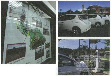 左圖是島內5座充電站的地圖。純電動汽車是日產汽車的“LEAF”。