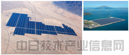 美國(guó)第一太陽(yáng)能供應(yīng)太陽(yáng)能電池的加利福尼亞州發(fā)電站(左)。發(fā)電輸出功率為55萬(wàn)千瓦,屬于全球最大級(jí)別。日本國(guó)內(nèi)最大級(jí)別、輸出功率為7萬(wàn)千瓦的鹿兒島市七島太陽(yáng)能發(fā)電站。