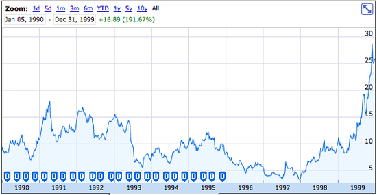 在蘋果處于最困難時候,史蒂夫·喬布斯伴隨著公司對NeXT的收購而回到蘋果。隨后,喬布擔當著引領蘋果創(chuàng)新和實現(xiàn)增長的使命。到1990年末,蘋果已經(jīng)實現(xiàn)了又一個10年的增長,其股價在1990年代的10年中增長了191.67%。