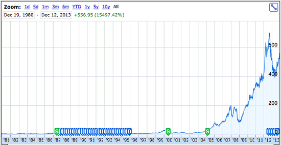 據(jù)國外媒體報道,蘋果于1980月12月12日首次公開招股(IPO),發(fā)行價22美元,共計出售了460萬股股票。這次IPO融資額度高于自1956年福特汽車(Ford Motor)上市以來任何一次IPO融資規(guī)模,并且當時立即創(chuàng)造了300位百萬富翁。